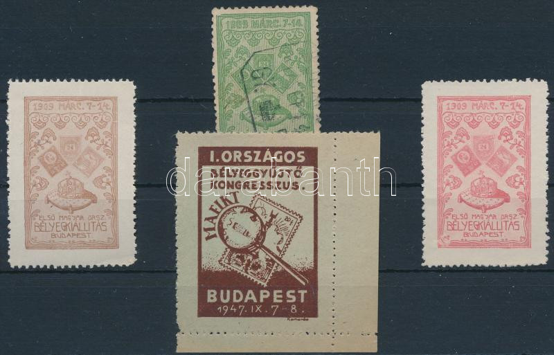 1909-1947 3 db klf színű az Első Magyar Orsz. Bélyegkiállítás levélzáró + I. Országos Bélyeggyűjtő Kongresszus, Budapest levélzáró