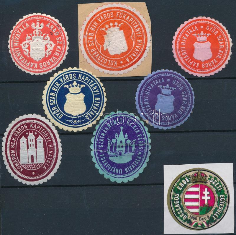 7 db kapitányi és főkapitányi pecsétbélyeg + Országos Erdészeti Egyesület öntapadós levélzáró