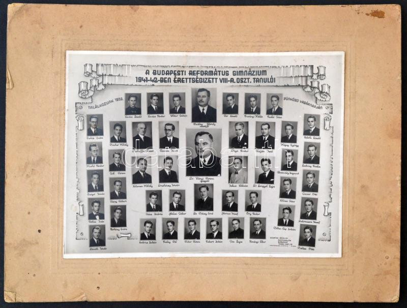 1942 Budapesti Református Gimnázium tanári kara és végzett növendékei, kistabló 45 nevesített portréval, 17x23 cm, karton 24x33 cm