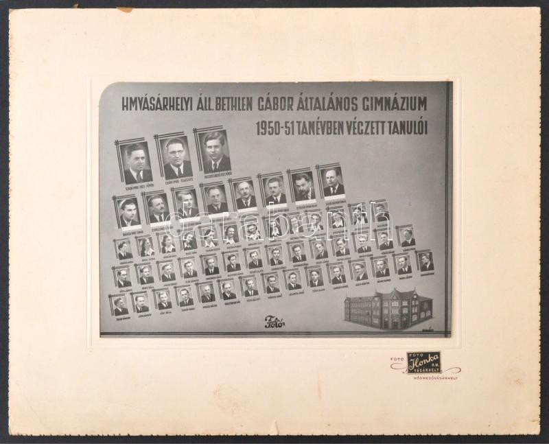 Description: 1951 Hódmezővásárhely, Bethlen Gábor Gimnázium tanári kara és végzett növendékei, kistabló 53 nevesített portréval, hátoldalon aláírásokkal, 17x23 cm, karton 29x35 cm