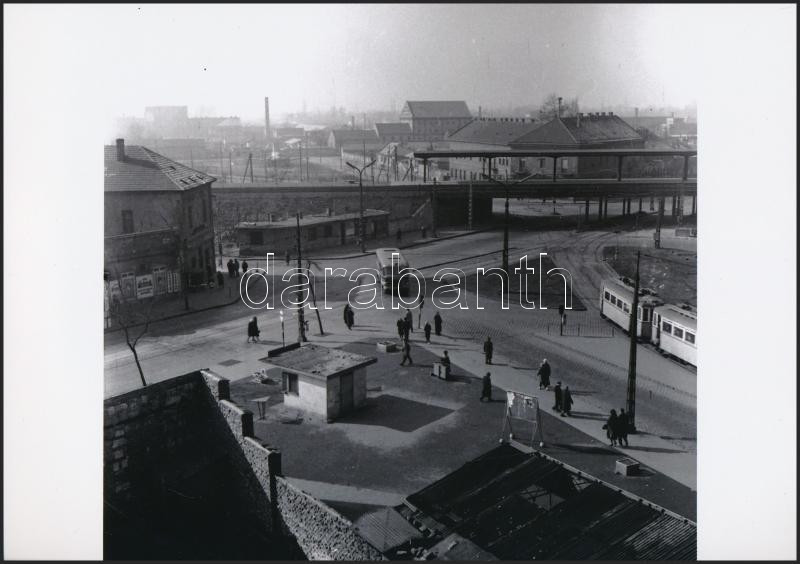 Description: cca 1963 Budapest, Kőbánya vasútállomás, autóbusz és villamos, Keveházi János hagyatékában őrzött vintage negatív mai nagyítása, 18x25 cm-es fotópapírra