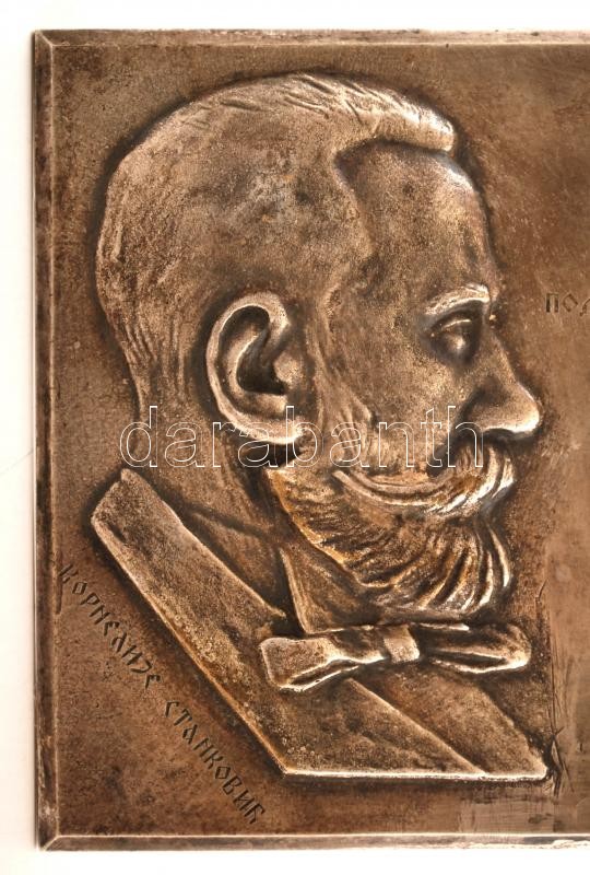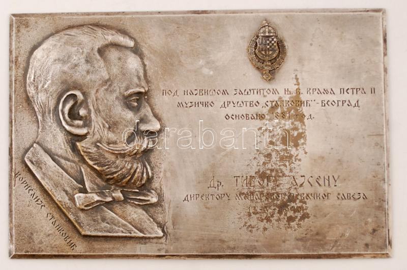 1940 A szerb Stanković Zenei Társaság fém emléktáblája Eisen Tibor (?-?) a Magyar Énekes Szövetség igazgatója részére, 12,5×19 cm / 1940 Metal memorial plaque of the Serbian "Stanković" Musical Society for Tibor Eisen (?-?) the director of the Hungarian Singing Society, 12,5×19 cm