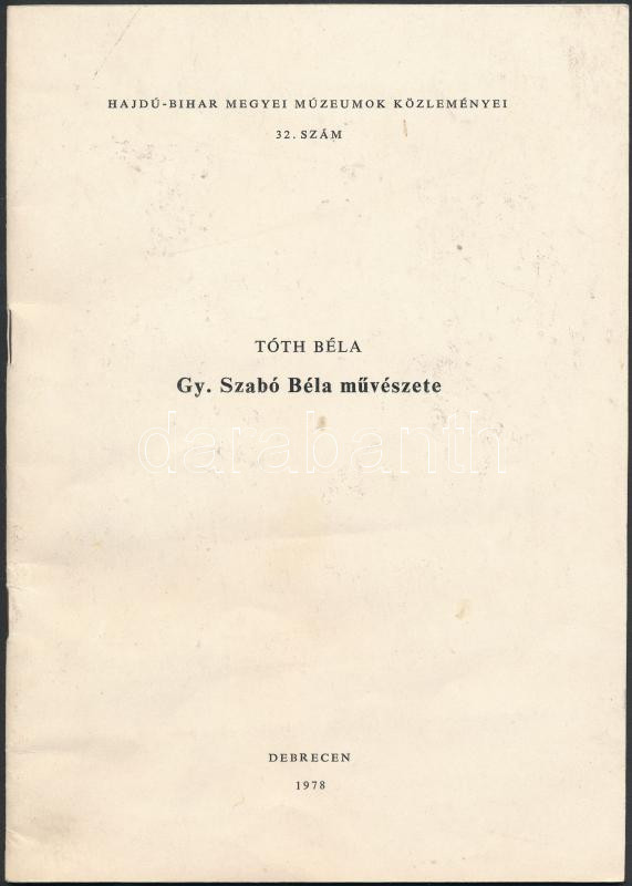 Tóth Béla: Gy. Szabó Béla művészete. Debrecen, 1978, [Hajdú-Bihar Megye Múzeumai] (Hajdú-Bihar megyei múzeumok közleményei 32.). Gy. Szabó Béla (1905-1985) által dedikált példány. Tűzött papÃrkötésben, jó állapotban.
