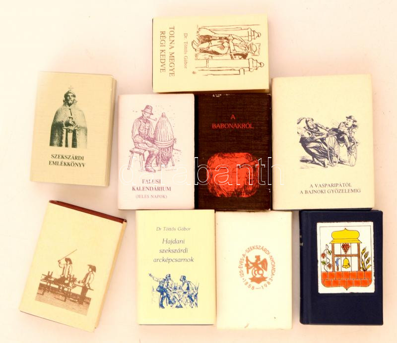 Vegyes minikönyv tétel, többségében szekszárdi vagy tolnai megyei vonatkozásokkal, a Szekszárdi Nyomda kiadásában, 9 db: Dr. Töttős Gábor: Hajdani szekszárdi esztendőben. Szekszárd, 1985, Szekszárdi Nyomda. Kiadói műbőr kötés, plakettel. Kiadták 1000 példányban. Dr. Töttős Gábor: Hajdani szekszárdi arcképcsarnok. Szekszárd, 1986, Szekszárdi Nyomda Miniatűrkönyv Gyűjtők Klubja. Kiadói műbőr kötés, kiadói papírkötésben. Kiadták 1000 példányban. Dr. Töttős Gábor: A vasparipától a bajnoki győzelemig. (A kerékpársport kezdetei Szekszárdon.) Szekszárd, 1986, Szekszárdi Nyomda Miniatűrkönyv Gyűjtők Klubja. Kiadói műbőr kötés, kiadói papírkötésben. Kiadták 2000 példányban. Dr. Töttős Gábor: Tolna megye régi kedve. Szekszárd, 1986, Szekszárdi Nyomda. Kiadói műbőr kötés, kiadói papírkötésben. Kiadták 1000 példányban. Dr. Szilágyi Mihály: Igazságszolgáltatás a régi Szekszárdon. Szekszárd, 1985, Szekszárdi Nyomda Miniatűrkönyv Gyűjtők Klubja. Kiadói műbőr kötés, kiadói papírkötésben. Kiadták 1000 példányban. Szekszárdi Emlékkönyv. Az apátság alapításának 925. és a vármegyeház avatásának 150. évfordulója alkalmából. Szekszárd, 1987, Szekszárdi Nyomda. Kiadói műbőr kötés, kiadói papírkötés. Kiadták 1000 példányban. Varga András (szerk.): A babonákról. Szekszárd, 1987, Szekszárdi Nyomda. Kiadói műbőr kötés, kiadói papírkötésben. Kiadták 2000 példányban. Varga András (szerk.): Falusi kalendárium. (Jeles napok). Szekszárd, 1988, Szekszárdi Nyomda. Kiadói műbőr kötés, kiadói papírkötésben. Kiadták 2000 példányban. Spiter Gézáné: Szekszárd város nyomdászata. 1858-1983. (A Szekszárdi Nyomda Vállalat rövid története.) Szekszárd, 1983, Szekszárdi Nyomda. Kiadói műbőr kötés, plakettel, kiadói papírtokban. Kiadták 1000 példányban.