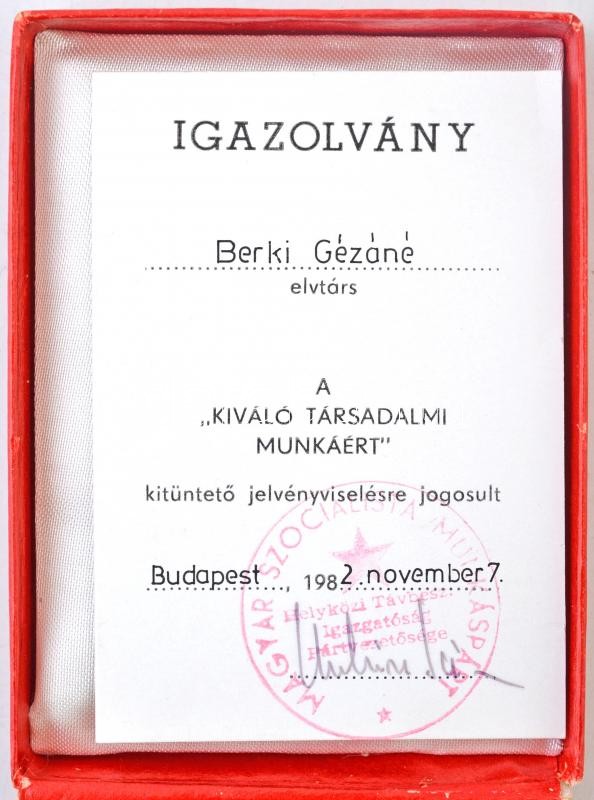 1982. "Kiváló Társadalmi Munkáért" zománcozott jelvény igazolvánnyal, tokban T:1-