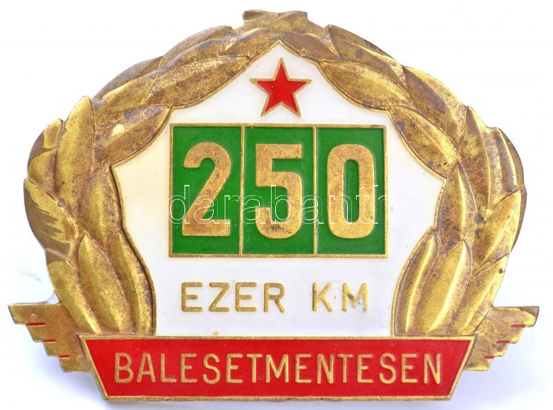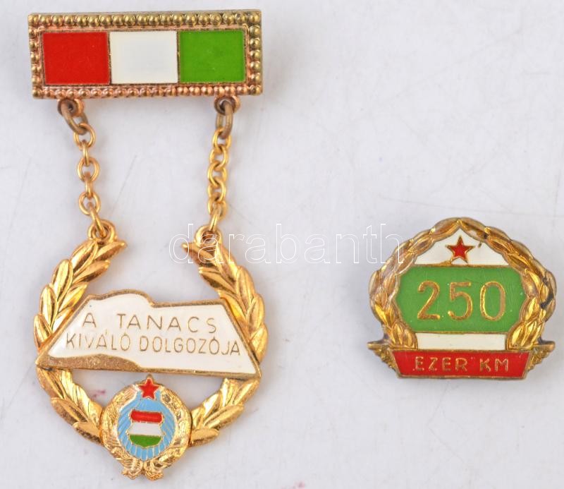 ~1970-1980. "250 ezer km balesetmentesen" zománcozott fém autójelvény, mellette kis jelvény (71x96mm) + "A Tanács Kiváló Dolgozója" zománcozott fém jelvény T:2