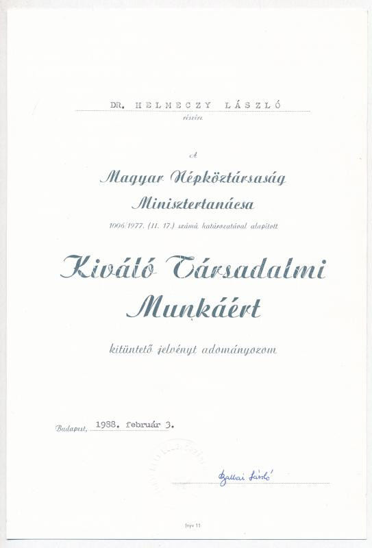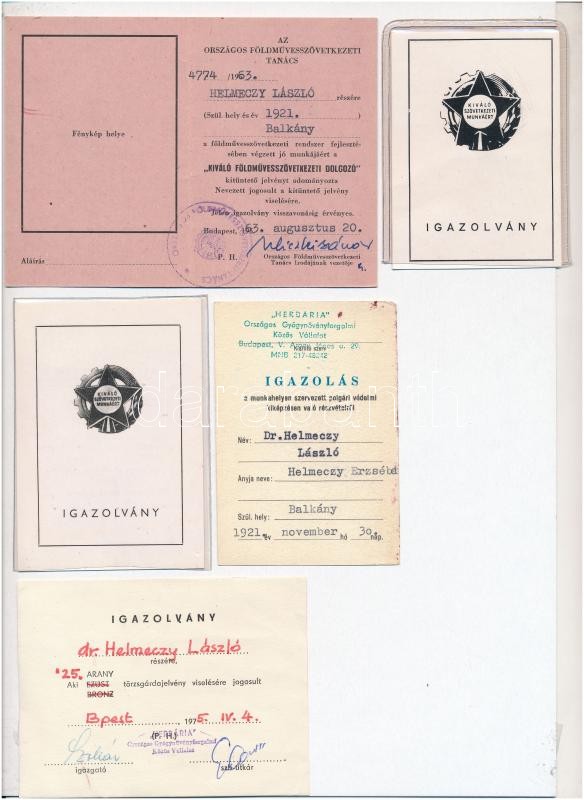 ~1970-1980. 5db-os vegyes kitüntetés adományozói okirat és igazolvány tétel, közte "Kiváló Társadalmi Munkáért" adományozói okirat szárazpecséttel és "Kiváló Szövetkezeti Munkáért" viselési igazolvány + 1db "a munkahelyen szerzett polgári védelmi kiképzésen való részvételről" igazolás