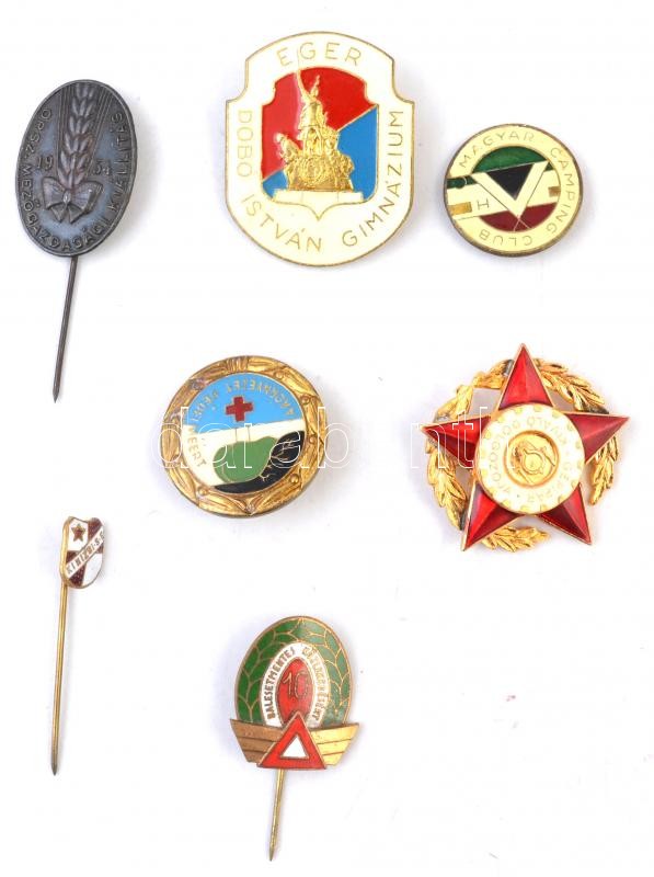 Vegyes 16db-os jelvény és kitűző tétel, közte DN "Dobó István Gimnázium - Eger" zománcozott fém jelvény, DN "Állami Petőfi Sándor Gimnázium - Aszód" zománcozott jelvény, tű nélkül, DN "Balesetmentes Közlekedésért - 10", 1954. "Országos Mezőgazdasági Kiállítás" fém kitűző T:2,2-
