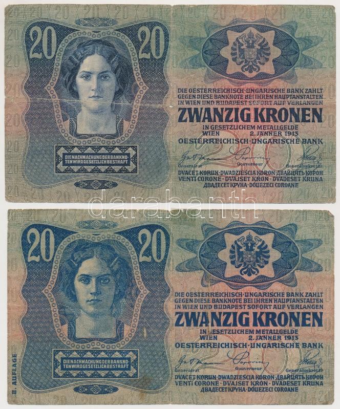 1913. 20K (2x) I. és II. kiadás T:III- egyiknél kis ragasztás