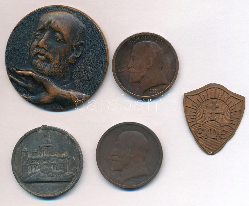 5db-os plakett, emlékérem tétel, közte Berán Lajos (1882-1943) 1925. "Jókai Mór 1825 - 1925 / A nagy mesemondónak hálás nemzete - Magyar Királyi Pénzverő" kétoldalas Br emlékérem (36mm) (2x), ~1920. "É.M.E. (Ébredő Magyarok Egyesülete)" Br plakett, "BERÁNN." gyártói jelzéssel (34,5x38,5mm) T:2-3-