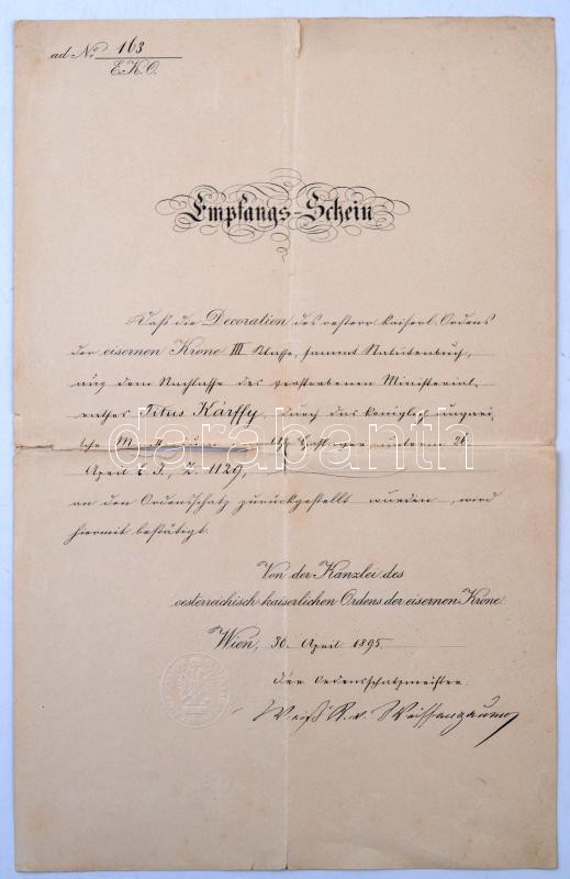 Description: 1895. Kárffy Titusznak (1825-1895) miniszteri tanácsosnak szóló hivatalos, német nyelvű levél, amelyben a harmadik osztályú vaskorona-rend kitüntetést adományozzák neki, szárazpecséttel T:III-,IV szakadással a hajtásoknál.