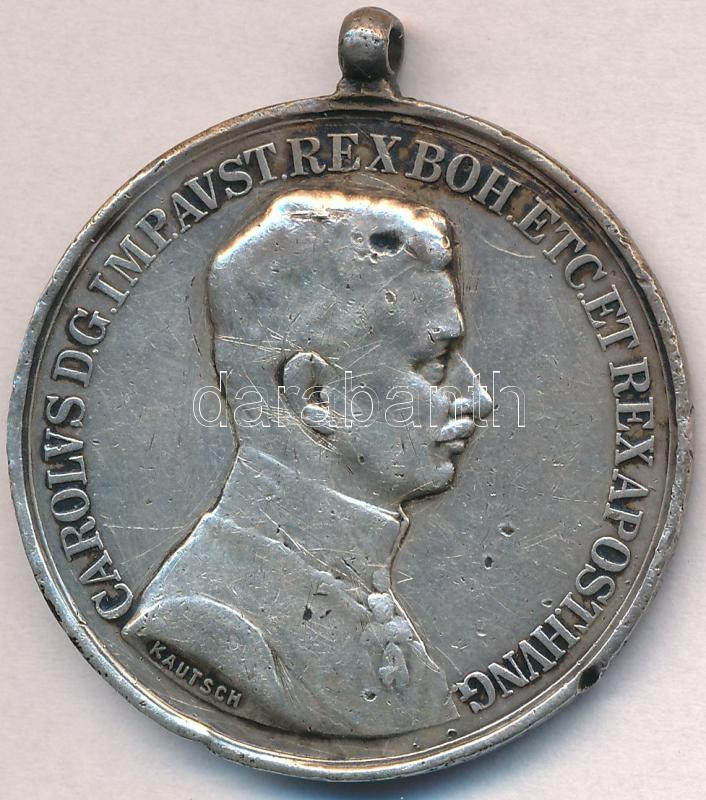 1917. "Károly Ezüst Vitézségi Érem I. osztálya" jelzetlen Ag kitüntetés, mellszalag nélkül. Szign.: Kautsch T:2-,3 ü., ph. Hungary 1917. "Silver Gallantry Medal, 1st Class" Ag decoration, without hallmark and ribbon Sign.: Kautsch C:VF,F dinh, edge error