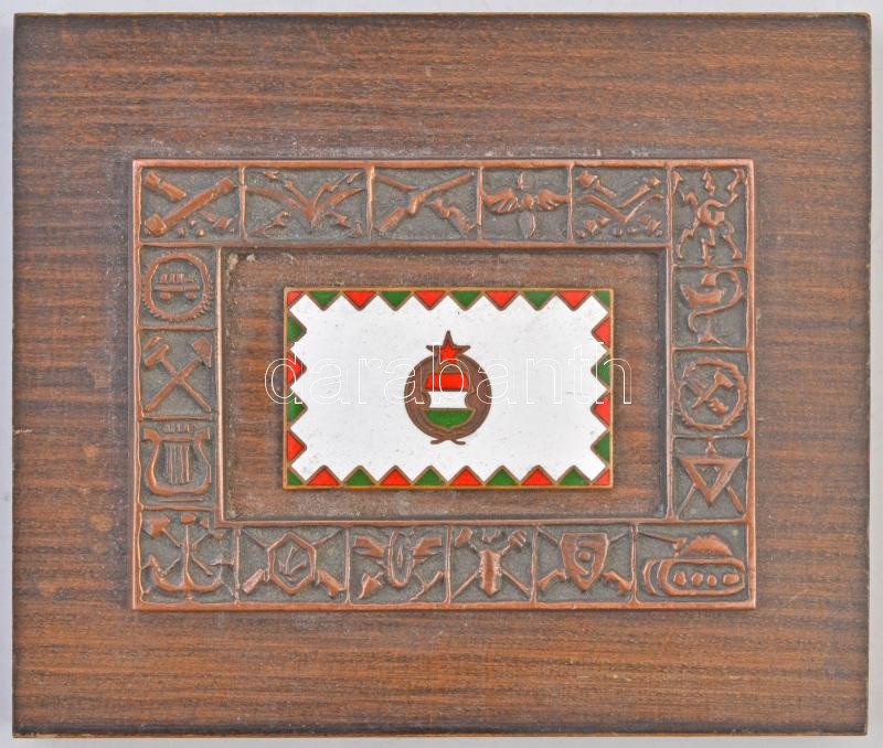 DN "Magyar Néphadsereg" zománcozott Br plakett, a Néphadsereg fegyvernemi jelvényeivel, falapra rögzítve (plakett 56x77mm, falap 90x106mm) T:2