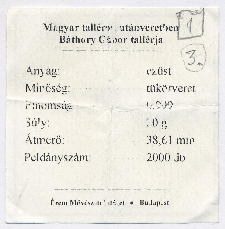 Magyar tallérok utánveretben "Báthory Gábor tallérja 1609" Ag emlékérem, tanúsítvánnyal (20g/0.999/38,6mm) T:PP