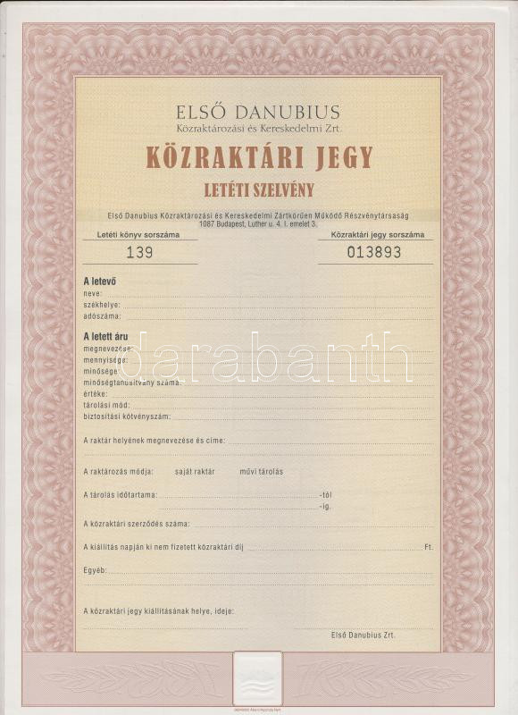 https://www.darabanth.com/en/277-Online-auction/277.0/Numismatics/Shares-and-Tickets~400005/7E1990-Elso-Danubius-Kozraktarozasi-es-Kereskedelmi-Zrt-Kozraktarozasi-Jegy-kitoltetlen-~II1415845