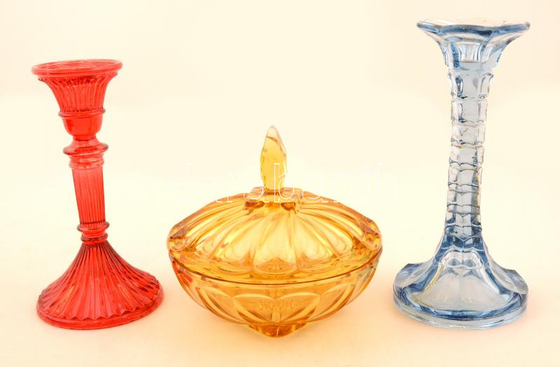 Dekoratív bonbonier apró csorbával és 2 db formába öntött színes gyertyatartó, egyiken apró csorbával, m:21 és 18 cm