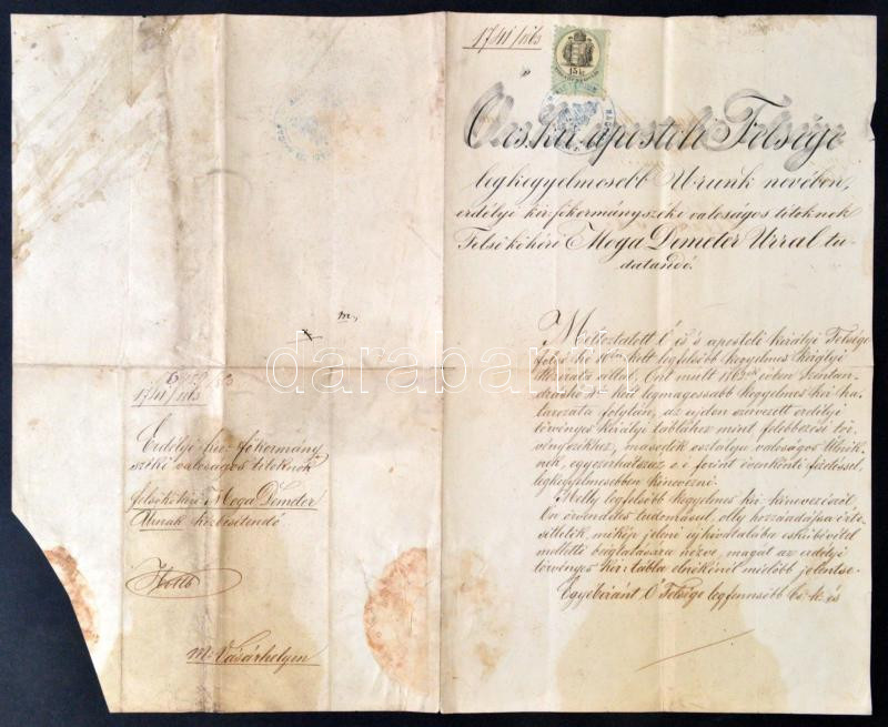 1863 Nádasdy Lipót (1802-1873) FelsÅ‘köhéri Móga Demeter (1812-1873) erdélyi királyi fÅ‘kormányszéki valóságos titoknok kinevezése, az újonnan szervezett erdélyi törvényes királyi tábla második osztályú valóságos ülnökének, illetékbélyeggel, Nádasdy Lipót aláÃrásával, maszatos, foltos és az egyik sarkánál némi hiánnyal.