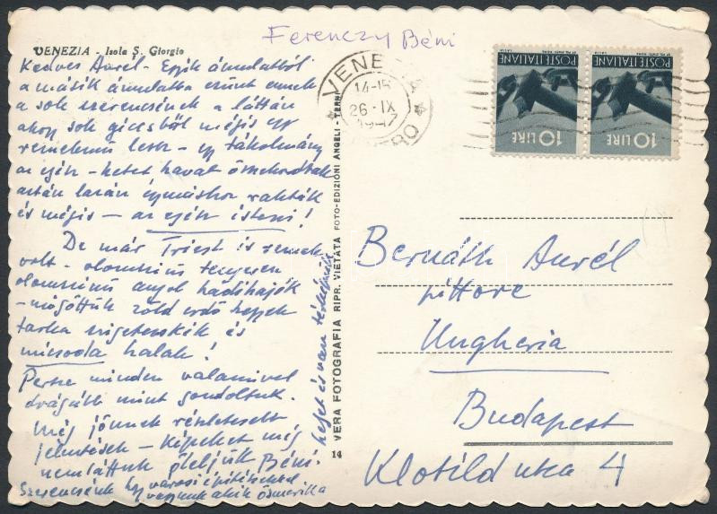Description: 1947 Ferenczy Béni (1890-1967) festőművész saját kézzel írt személyes képeslapja Bernáth Aurél festőművésznek, melyben Olaszországi úti élményeiről számol be.