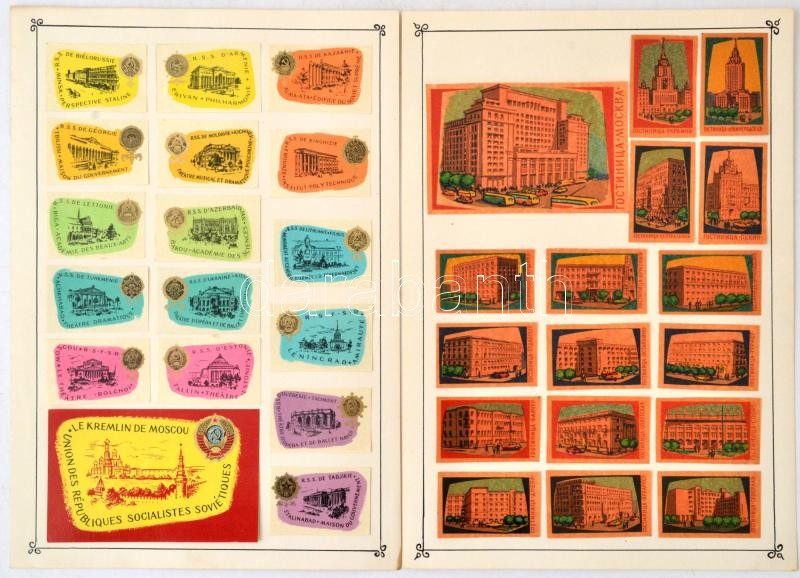 Description: Szovjet gyufacímke gyűjtemény:látogatás a SzU-ban, nagyszínház, építészet, óriások, Moszkva, stb. témában, 13db kartonon, 221db+4db nagyméretű, különböző méretben