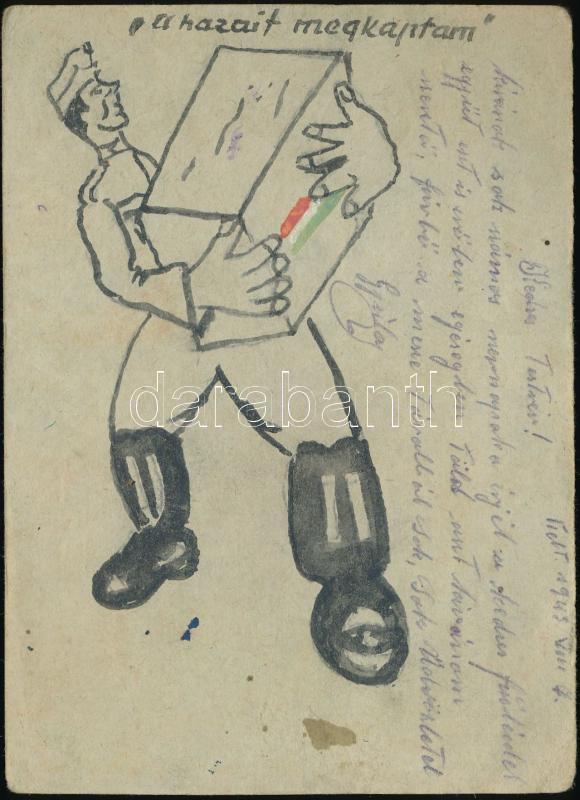 1943 A hazait megkaptam! Humoros, kézzel festett tábori postai levelez...