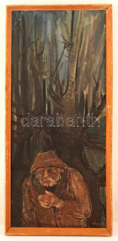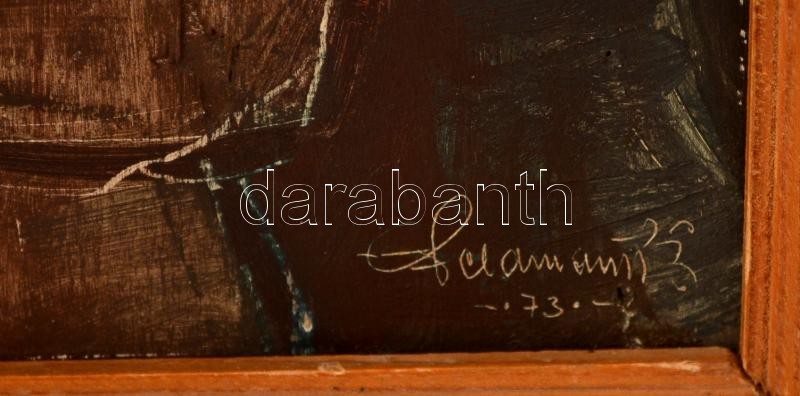Feldmann Tibor (1945-1995): Öregember 1975. Olaj, farost, jelzett, keretben, apró hibákkal, 67×28 cm