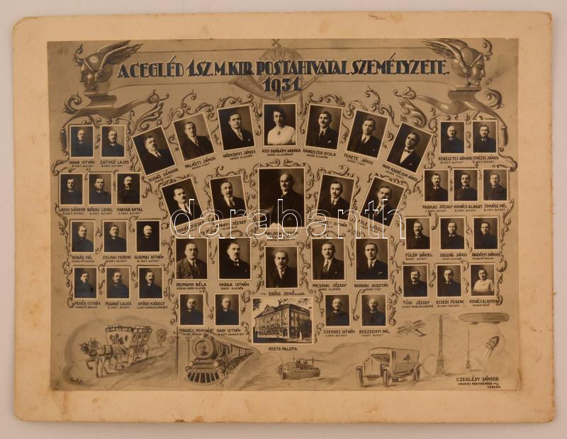 1931 A Ceglédi 1. sz. M. kir. Postahivatal Személyzete, Czeglédy Sándo... https://www.darabanth.com/en/277-Online-auction/277.0/Other-collectibles/Photo~19/1931-A-Cegledi-1-sz-M-kir-Postahivatal-Szemelyzete-Czegledy-Sandor-udvari-fenykepesz-fel~II1417984