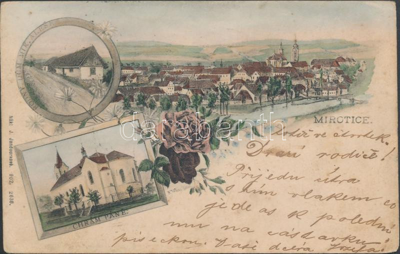 Mirotice, Chram Pane, Rodny Dum Mik. Alese; Naklad J. Jandourkove / church, the birth house of Mikolas Ales; floral (EB)