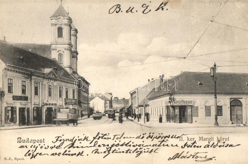 Budapest II. Margit körút, gyógyszertár, Glauber Ignác üzlete, villamo...