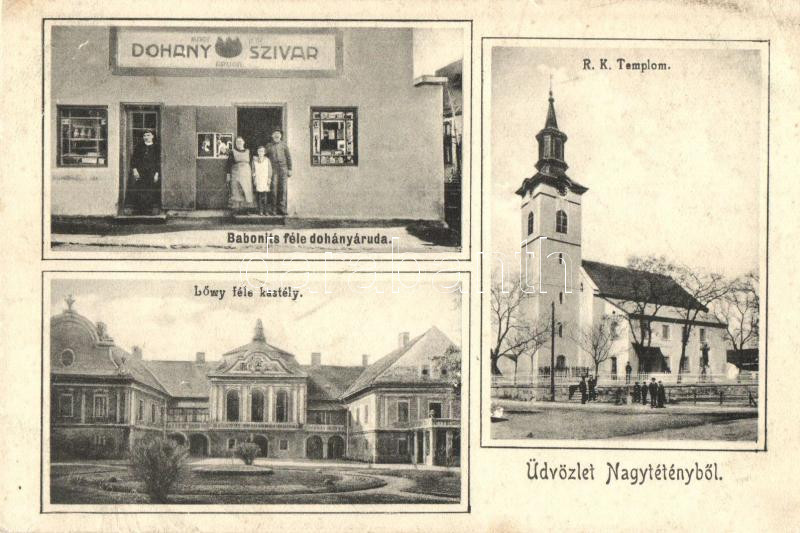 Budapest XXII. Nagytétény, Lőwy féle kastély, Babonits féle dohányáruda, római katolikus templom, kiadja Babonits Ferenc (Rb)