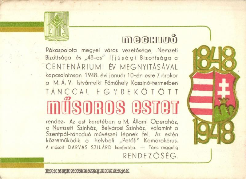 1948 Meghívó a rákospalotai '48-as' centenáriumi év megnyitásával kapc...
