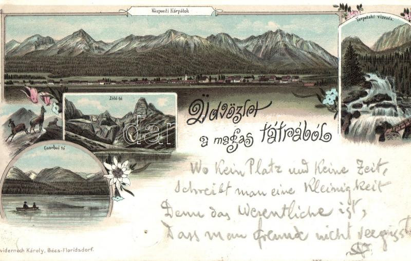 1897 Tátra, Központi Kárpátok, Zöld-tó, Csorba-tó, Tarpataki vízesés / lakes, floral, litho