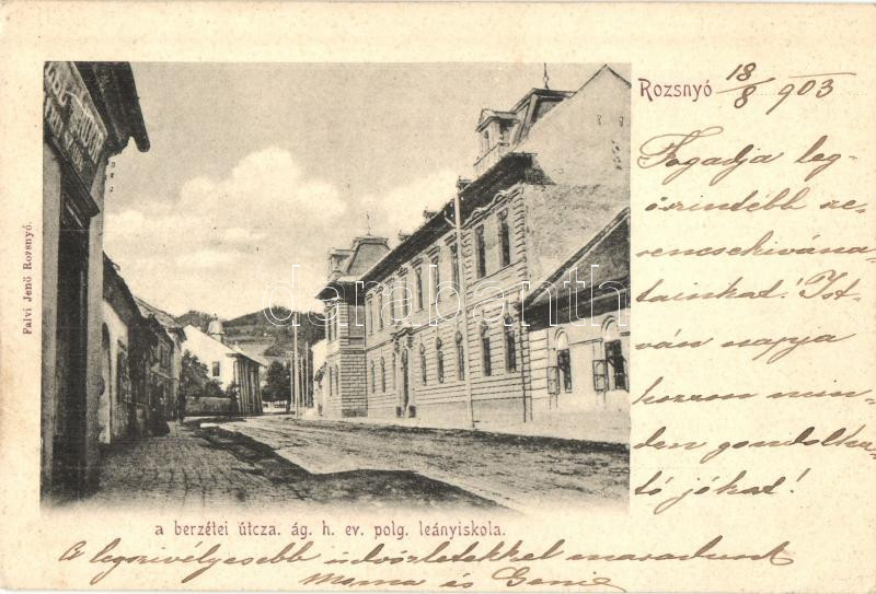 Rozsnyó, Roznava, Roseanu; Berzéti utca, Ágostoni hitvallású evangélikus leányiskola, kiadja Falvi Jenő / street, girl school