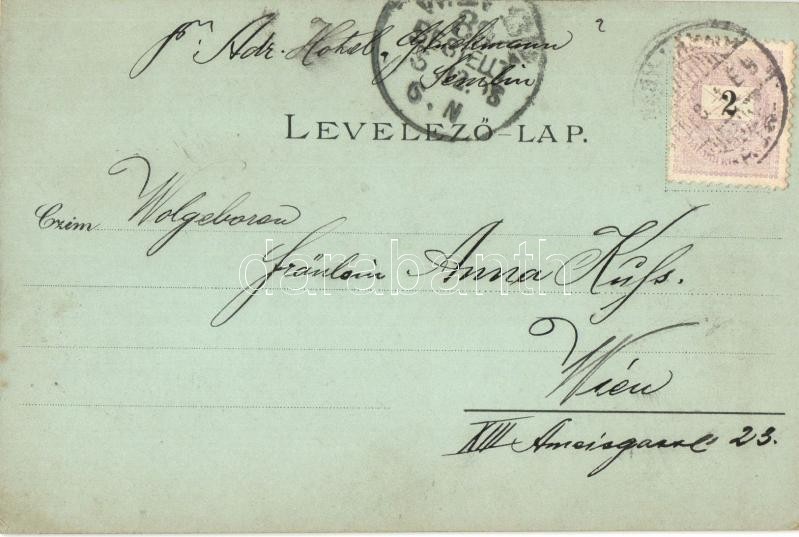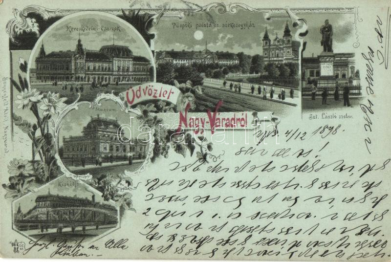 1898 Nagyvárad, Oradea; Kereskedelmi Csarnok, Püspöki Palota és székesegyház, Múzeum, Kishídfő, Szent László szobor, kiadja Sonnenfeld Adolf / Commercial Hall, Bishop's Palace, cathedral, museum, bridge, statue, floral, Art Nouveau litho