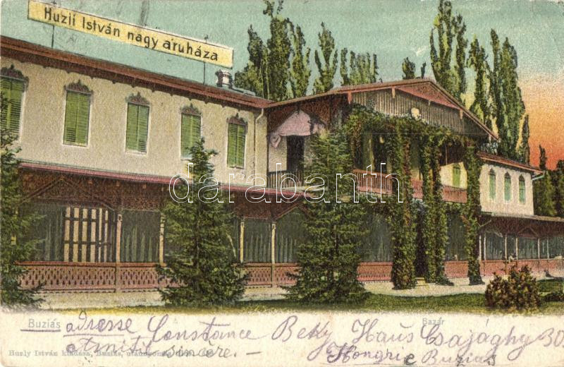 Buziásfürdő, Buzias; Huzli István nagyáruháza, bazár, kiadja Huzly Ist...