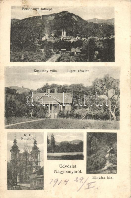 Nagybánya, Baia Mare; Felsőbánya látképe, Kosutány villa, Liget, Bányá...
