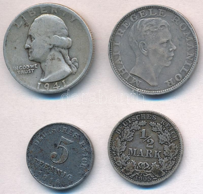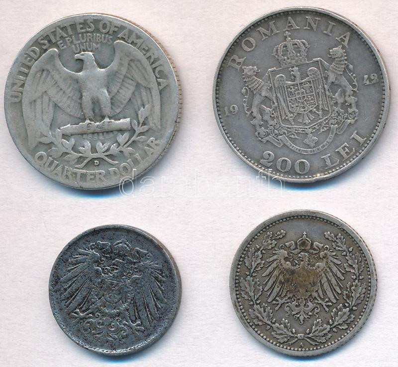 Description: Vegyes: Amerikai Egyesült Államok 1941D 1/4$ Ag "Washington" + Német Birodalom 1905A 1/2M Ag + 1916. 5pf Fe + Románia 1942. 200L Ag T:2,2-,3