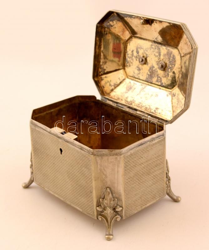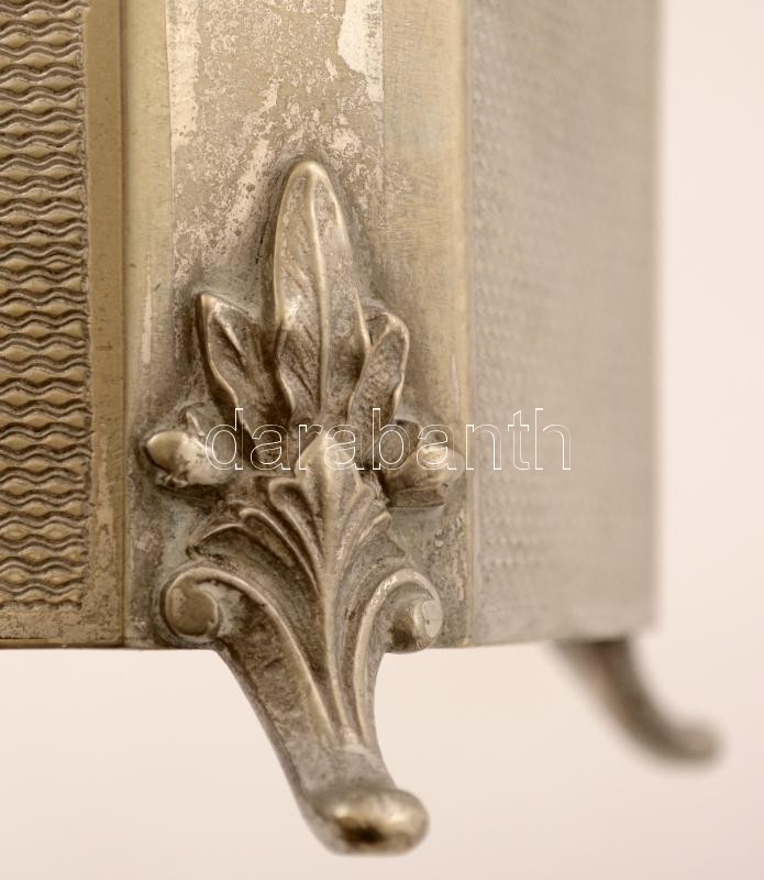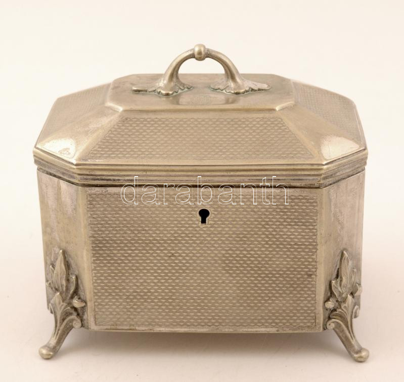 Díszes alpakka cukordoboz zárható, de kulcs nélkül. 15x11x13 cm