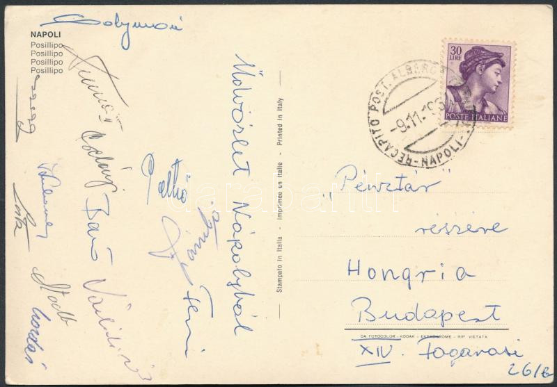 1960 Az Újpest labdarúgóinak (Bene, Káposzta, Solymosi, Faragó, Zámbó...stb) aláírásai egy Nápolyból küldött levelezőlapon.