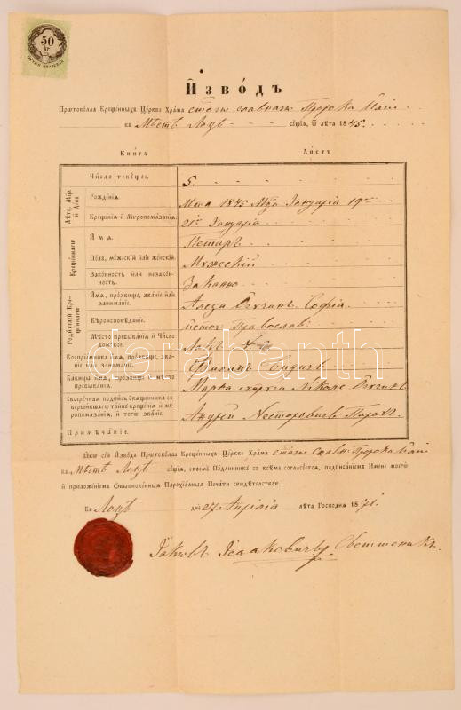 1871 Sajkáslak (ma: Lok, Szerbia), óegyházi szláv nyelvű anyakönyvi kivonat, rányomott viaszpecséttel, okmánybélyeggel