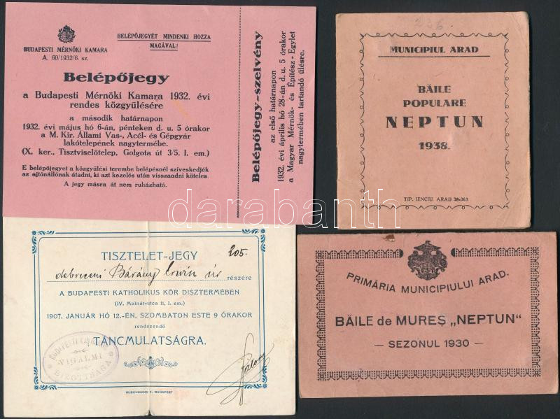 1907-1950 Vegyes belépőjegy tétel(Budapesti Mérnöki Kamara, Bäile de M... https://www.darabanth.com/en/278-Online-auction/278.0/Other-collectibles/Documents~37/1907-1950-Vegyes-belepojegy-tetelBudapesti-Mernoki-Kamara-Baile-de-Mures-Neptun-Budapesti-K~II1428695