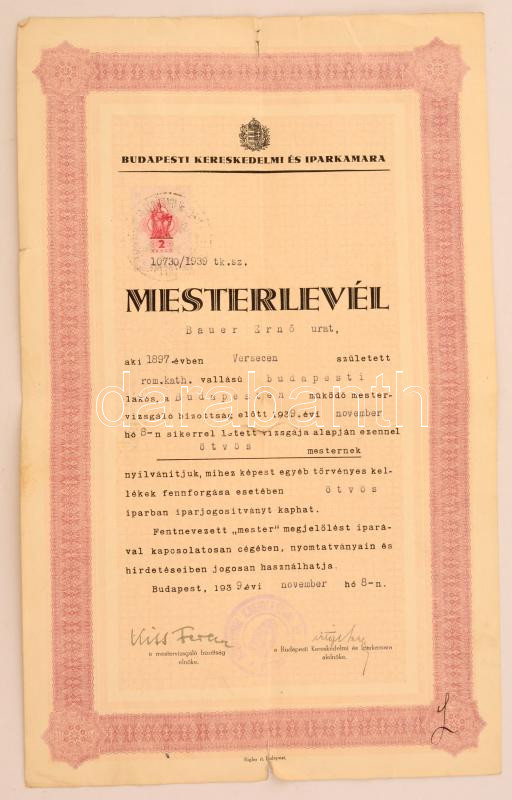 1939 A Budapesti Kereskedelmi és Iparkamara által ötvös részére kiállított mesterlevél, okmánmybélyeggel