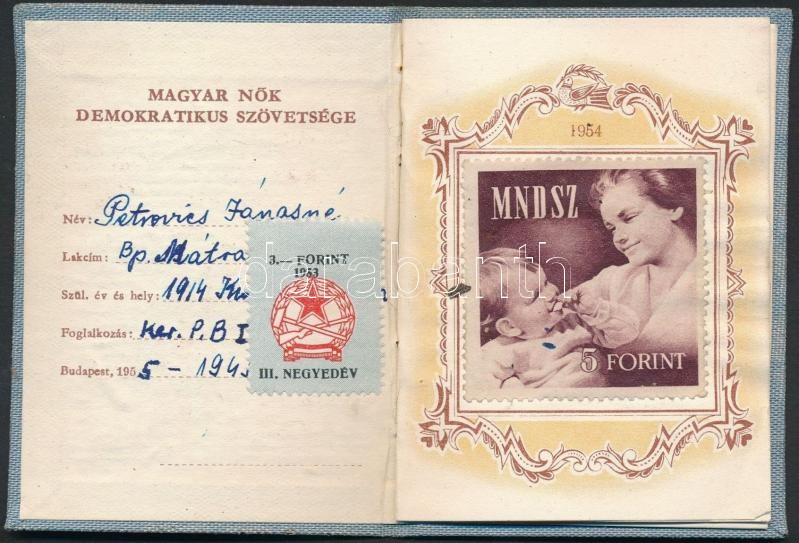 1953 Magyar Nők Demokratikus Szervezete tagsági könyv, tagsági bélyege...
