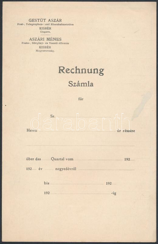 https://www.darabanth.com/en/278-Online-auction/278.0/Other-collectibles/Documents~37/cca-1920-Kisber-az-aszari-menes-posta-surgony-es-vasuti-allomas-kitoltetlen-fejleces-~II1429210