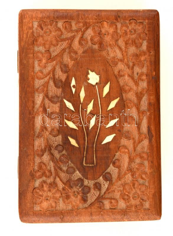 Díszesen faragott intarziás fa ékszertartó doboz, 15,5×10,5×6,5 cm