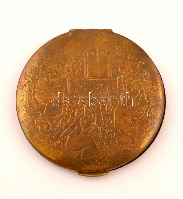 Gazdagon díszített réz púdertartó, d: 8 cm