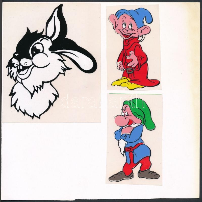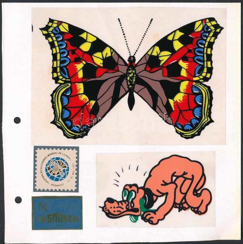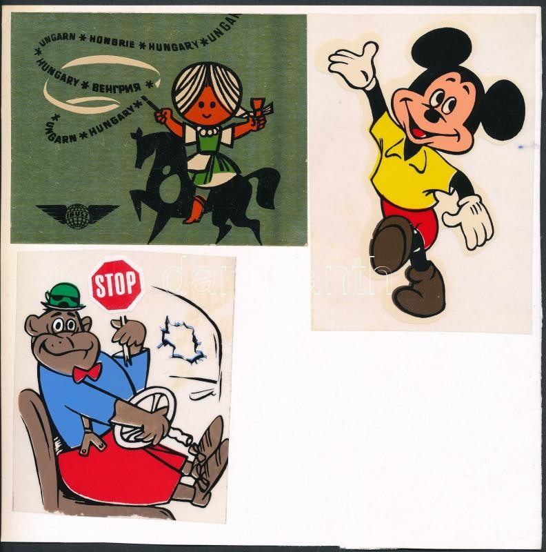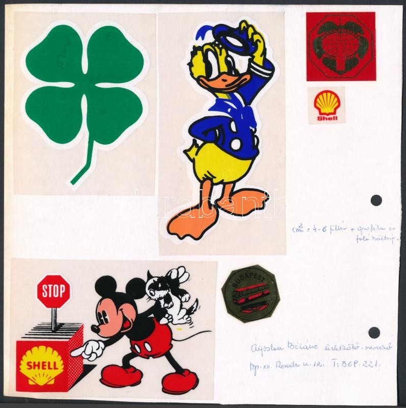 Különféle matricák gyűjteménye, kb. 40 db matrica 3 db kartonon.