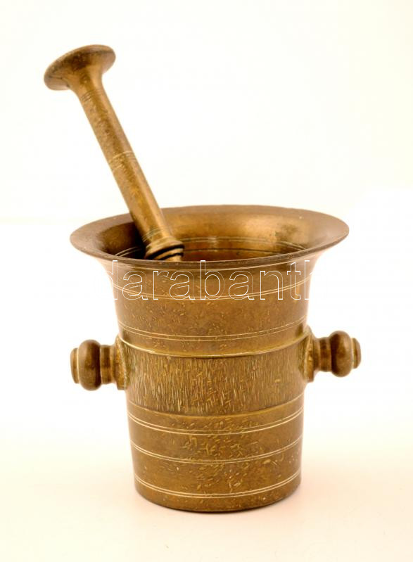 Réz mozsár törővel, m: 12 cm, d: 13 cm, h: 22 cm