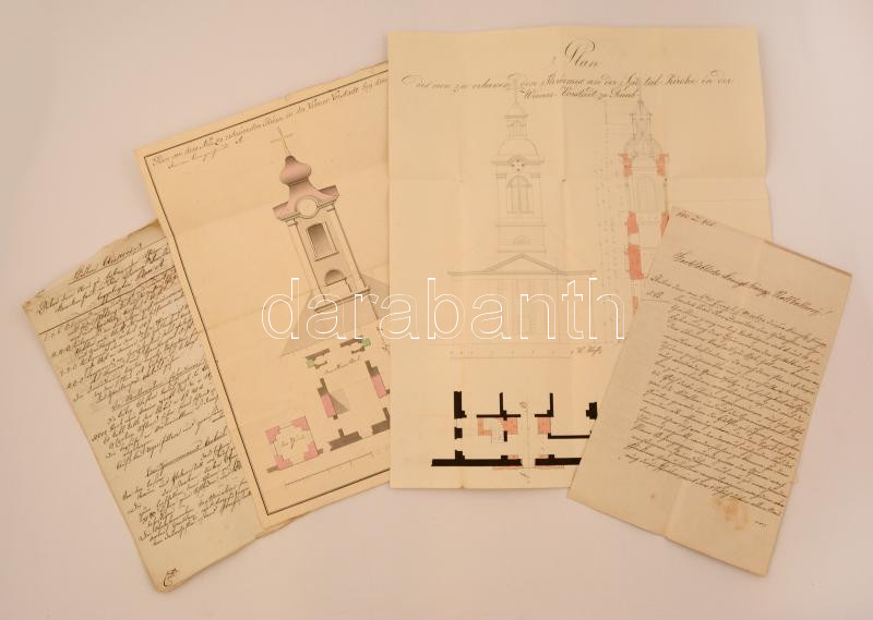Description: 1826 Győr, az újvárosi kórház templomtornyának építésével kapcsolatos régi dokumentumok, tervek 4 db / Plan des neu zu erbauenden Thurmes an der Spital Kirche in der Wiener Vorstadt zu Raab