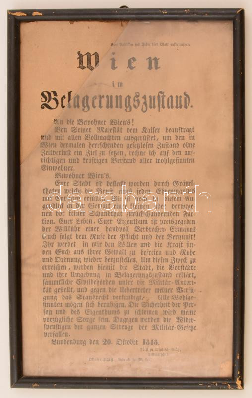 1848 Lundenburg, Windisch-Grätz német nyelvű felszólítása a bécsiekhez az ostromállapotról, üvegezett keretben, 38x23 cm