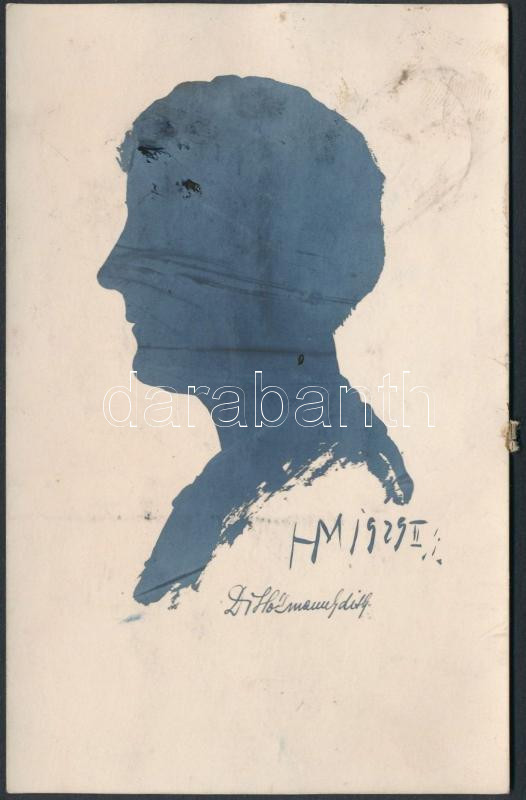 Description: 1929 Hoffmann Edith művészettörténész, muzeológus (1888-1945) saját magáról készített árnyképe, képeslapként Ortvay Rudolf egyetemi tanárnak küldve. (meghívó hétvégi kirándulásra). 14×9 cm